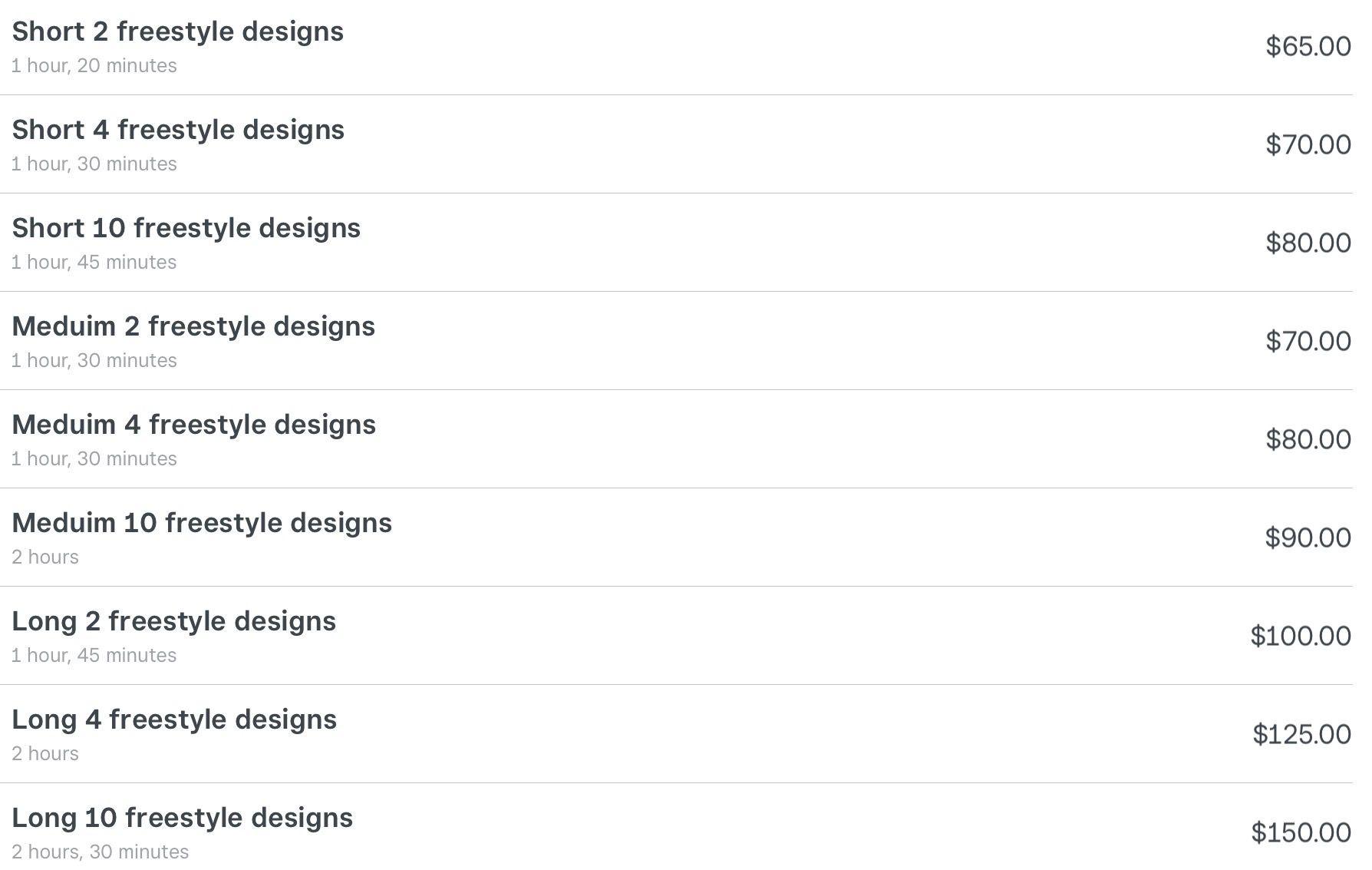 An additional fee will apply for custom designs or complex artwork. Prices listed are based on my signature styles and techniques. I'll work with you to discuss specifics and provide a quote if time allows.